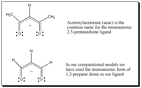 In this computation and animation 1,3-propanedione serves as an analog for the acac (acetylacetonate = 2,5-pentanenedione) ligand.